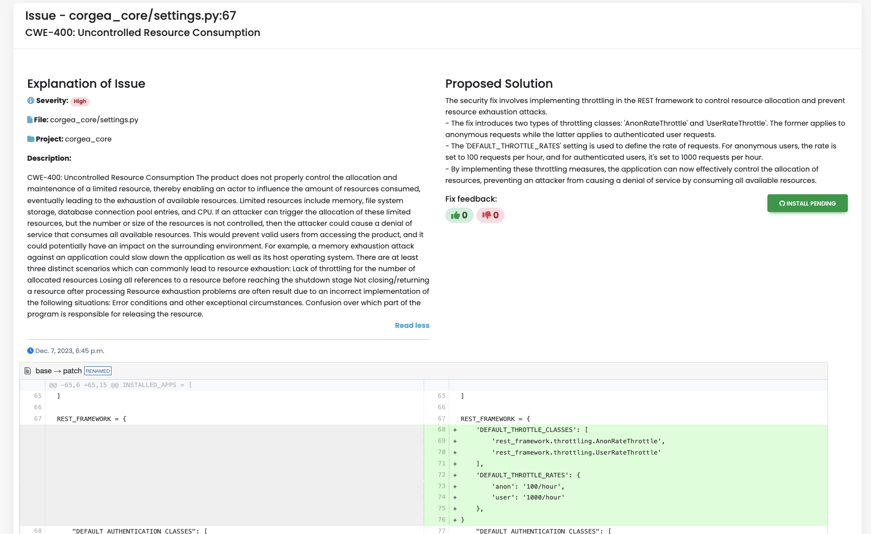 The issue, identified as CWE400 (uncontrolled resource consumption), was detected in the Django settings file because there was no rate limiting imposed on the Django REST Framework. This allows an attacker to conduct a Denial of Service attack by bombarding the application with a lot of API requests. To solve for this in code is:- Limited resources available to both anonymous and logged-in users.