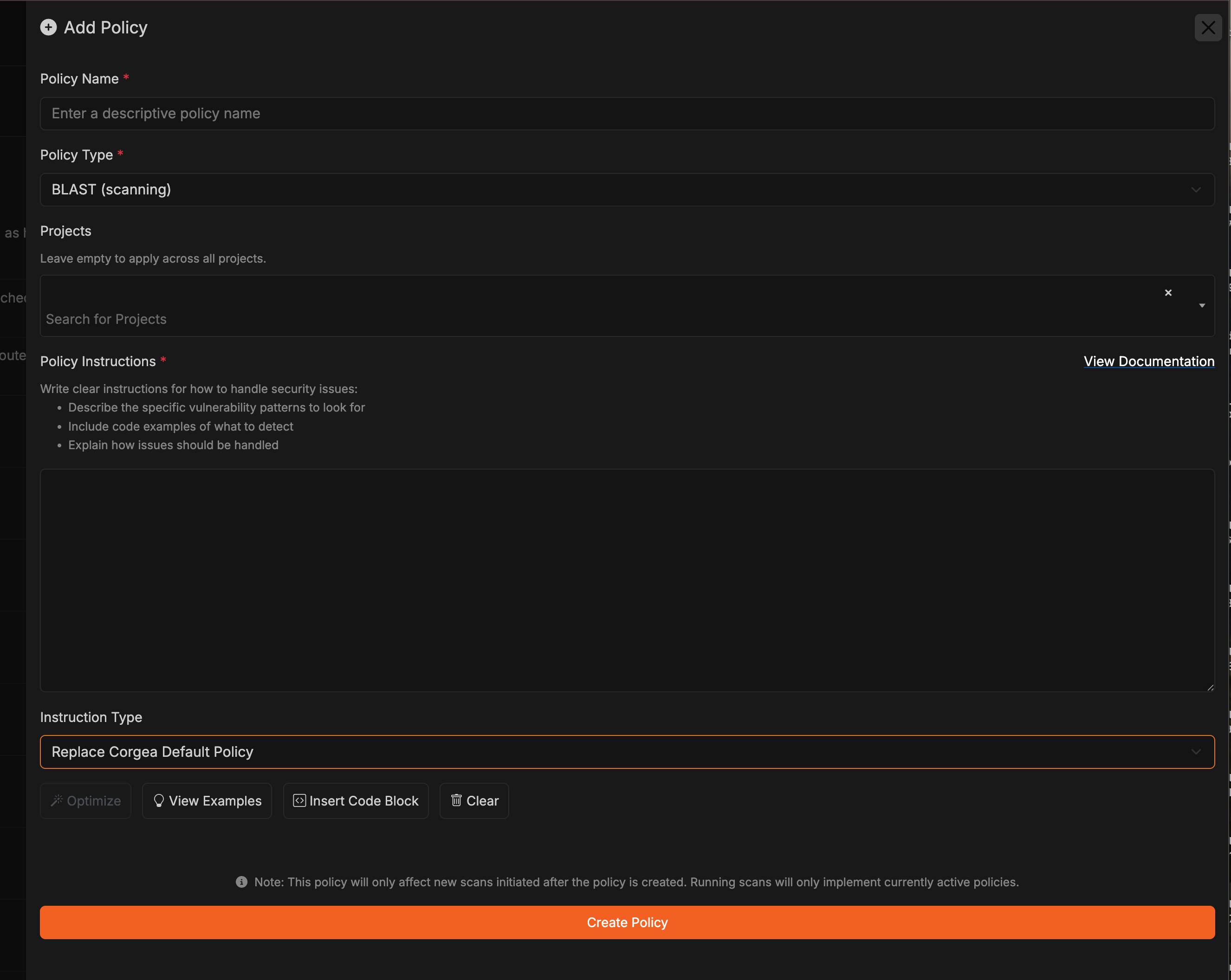 - Append to Corgea Default Policy: Adds your policy instructions to Corgea’s built-in policies, preserving both sets of rules. Use this when you want to enhance the default policies with your specific business context, security controls, or environmental details.